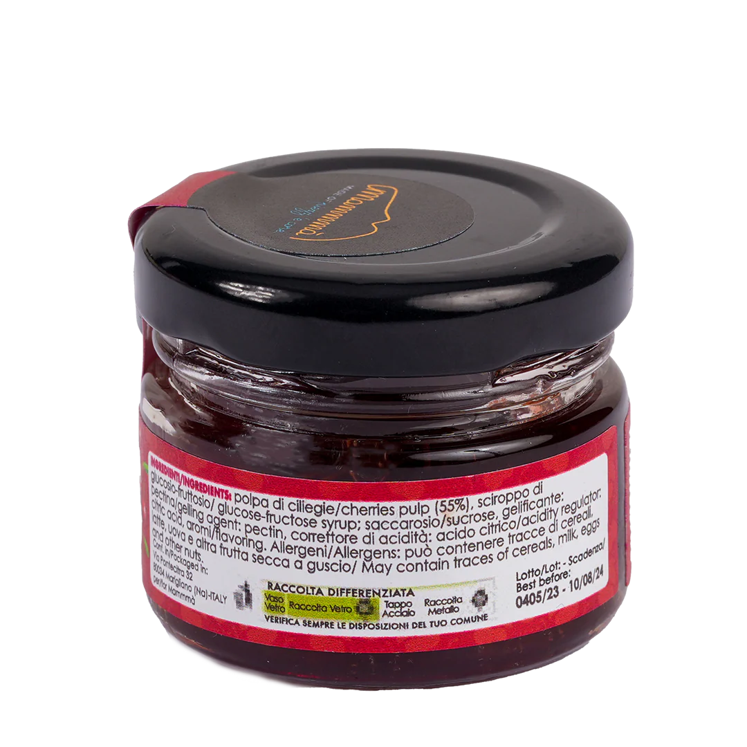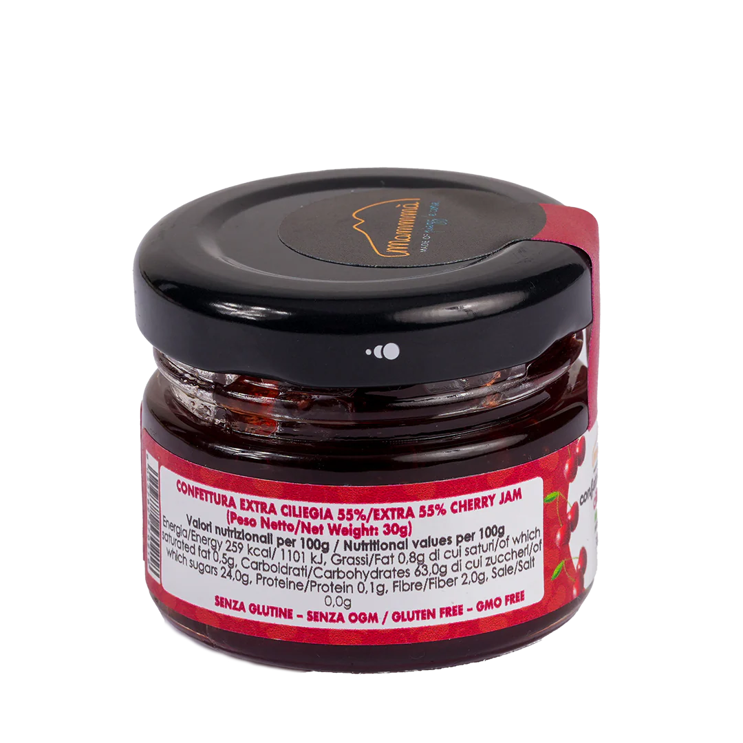 La Confettura Extra 55% alle Ciliegie di MAMMMÀ ha il 55% di pura polpa di Ciliegie.