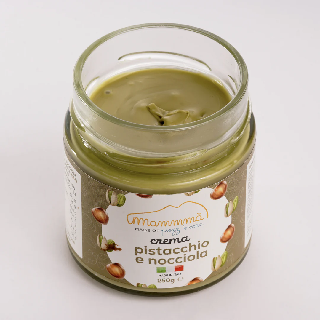 La Crema al Pistacchio e Nocciola di MAMMMÀ unisce il 20% di pistacchi e il 15% di nocciole, creando un connubio divino in cui il gusto intenso e aromatico delle nocciole si fonde con la pronunciata sfumatura del pistacchio. Una sinfonia di sapori!