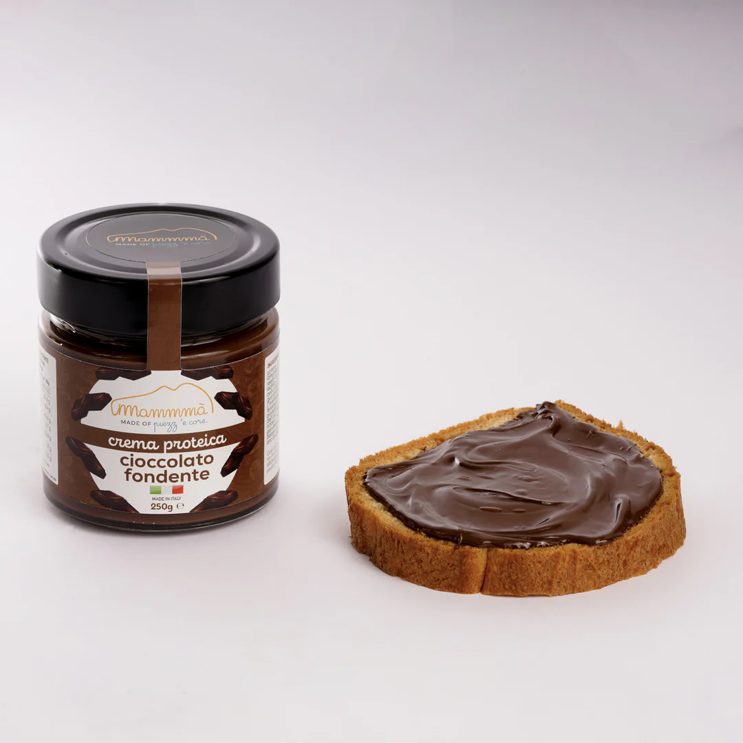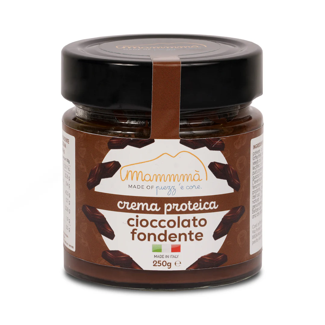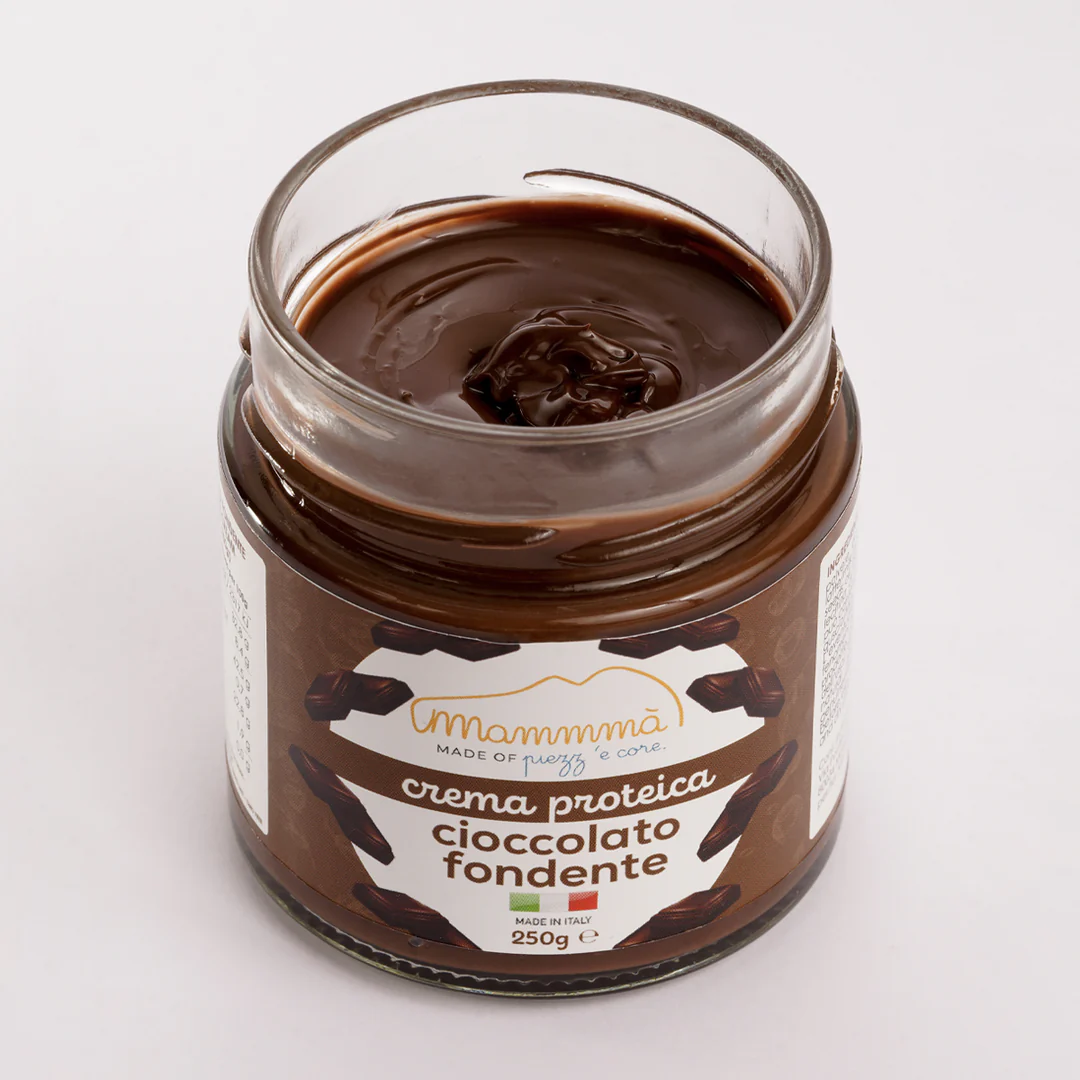 La Crema Proteica al Cioccolato Fondente di MAMMMÀ è un concentrato di energia e benessere, dalla consistenza morbida e avvolgente, ideale per gli amanti del gusto intenso del cioccolato.